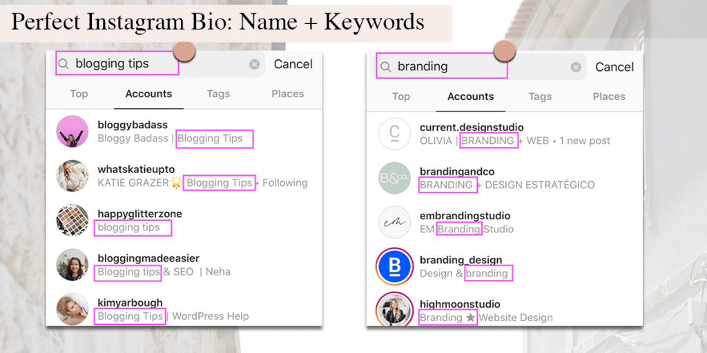 As you can see, I search for blogging tips and branding. Accounts with those keywords appeared at the top of my search.